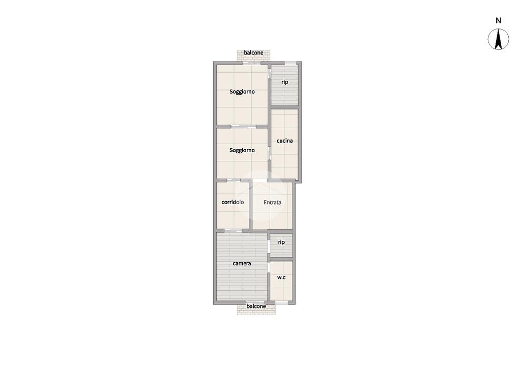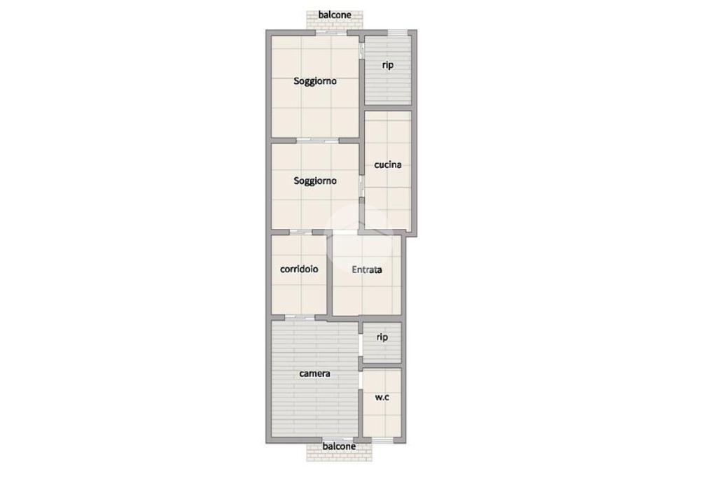 L’ingresso apre su un ampio salone luminoso, seguito da una cucina in muratura collocata in un ambiente separato. Sono inoltre presenti un ripostiglio, disimpegno, camera da letto, bagno e un secondo ripostiglio. I diversi ambienti si presentano in buone condizioni generali. Il piano è reso ancora più arioso dalla presenza di più balconi.